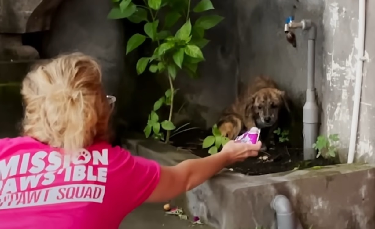 Prue cautiously approached the puppy, mindful of the potential dangers, until they reached a dead end near a nearby building. Drawing upon her experience, she knew that earning the pup’s trust was crucial to avoid any sudden escape attempts. Through soft sounds and tempting food offerings, Prue slowly built a connection with the frightened little one.