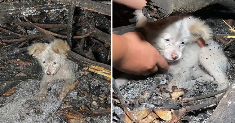 After a thorough search through the sprawling landfills, the rescuer finally discovered the pup concealed beneath a pile of firewood, seeking warmth and solace amidst the harsh surroundings.