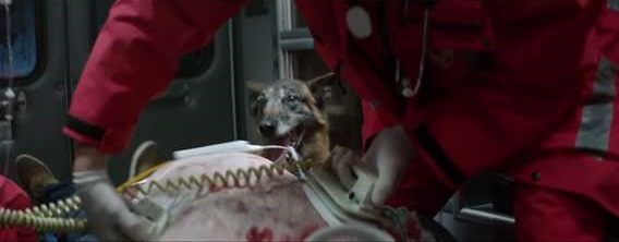 The dog is really concerned about the owner, who is gravely hurt and unconscious, and is faithfully waiting on the side to watch the emergency personnel treat and care for the owner.