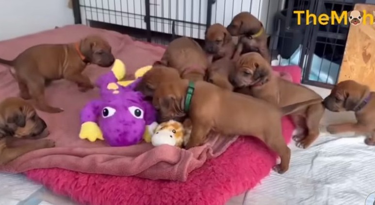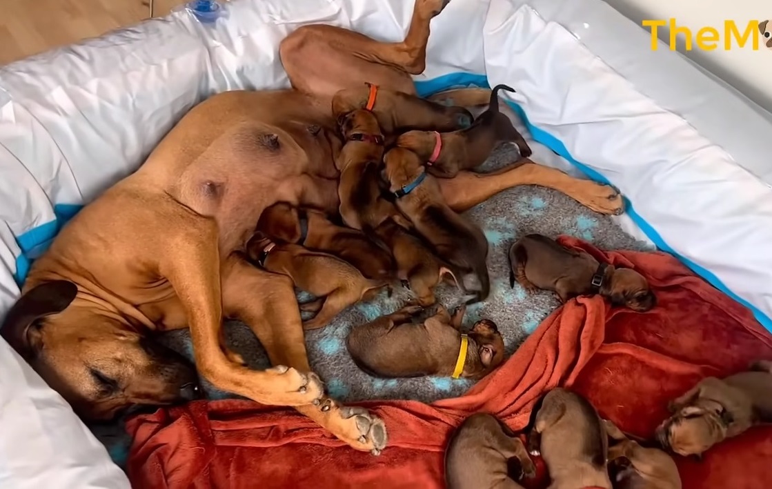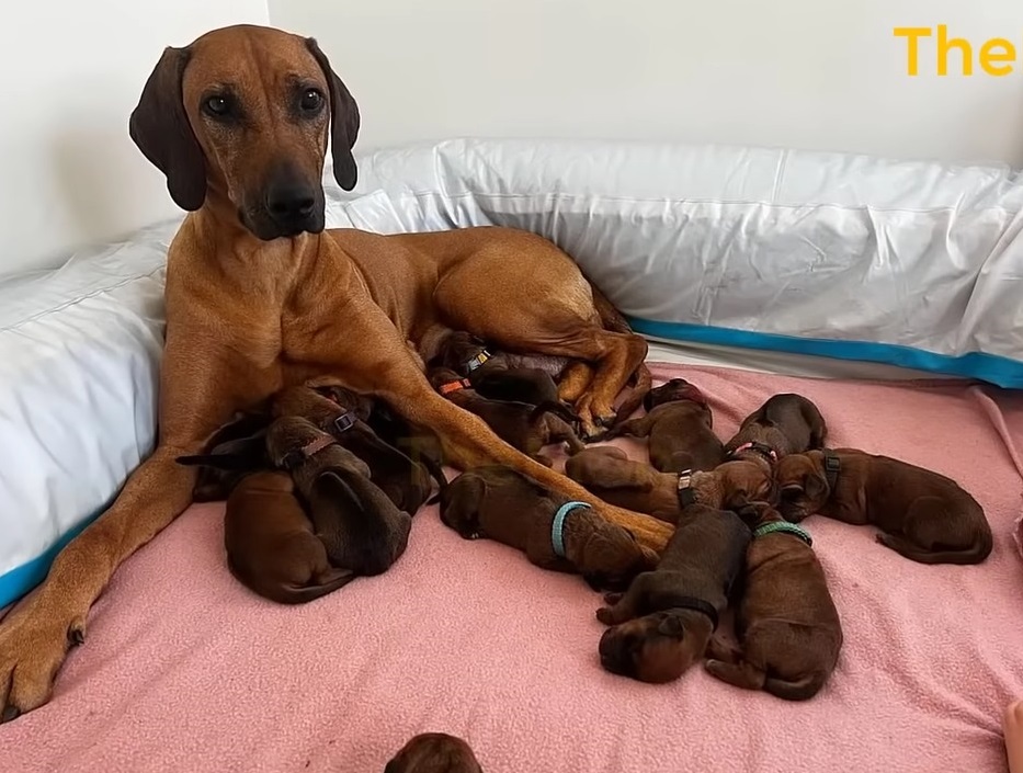 After spending six days in a veterinary clinic, Tiya entered the opening phase of labor. The rescuers, knowing the time was near, prepared for the joyous moment when they would meet Tiya’s puppies. And finally, the day arrived—Tiya gave birth to 15 strong and healthy puppies in less than 14 hours. There were eight females and seven males, with a mix of crown patterns among them.