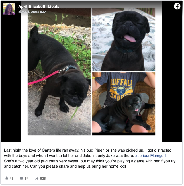 The family looked everywhere for the 2-year-old pug, but over two weeks passed and Piper was nowhere to be found.