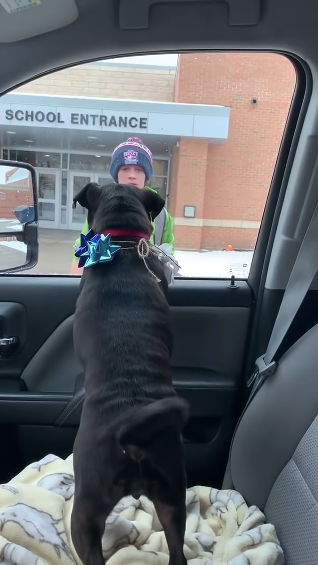 Dressing Piper up in bows, April took the dog to school to pick up Carter. Seeing her old friend through the car window, Piper perked up in excitement: