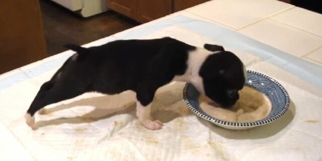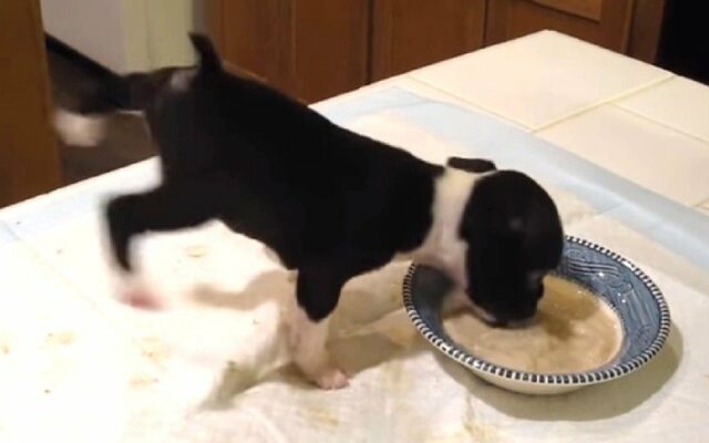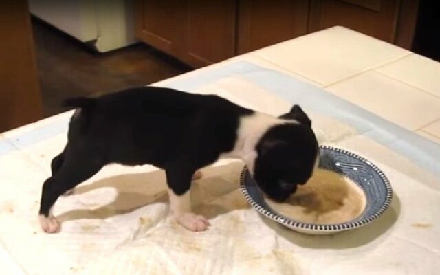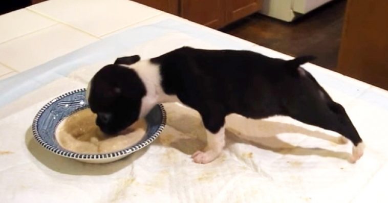 Like this Boston Terrier puppy. As he’s having dinner, his body just can’t control the excitement. His hind legs slowly begin stretching and lifting up in the air all on their own!