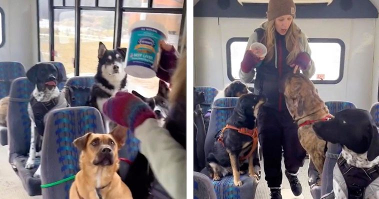 Watch as they all sit obediently and patiently as they are transported from adventure to adventure and back home on the doggy bus…