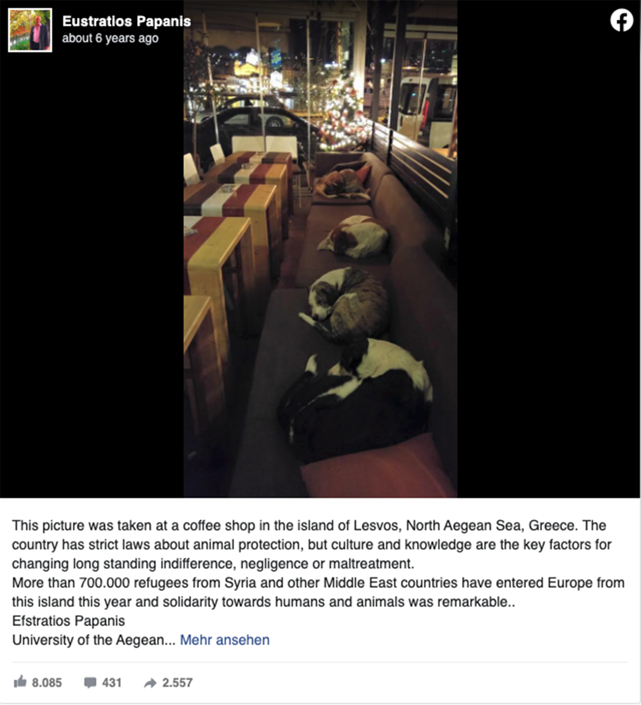 That spirit is best represented by how one cafe stepped up to help their local dog population. In the summer of 2015, Hott Spott, a cafe on the island of Lesbos, started opening their doors after hours to let dogs come in and stay the night.