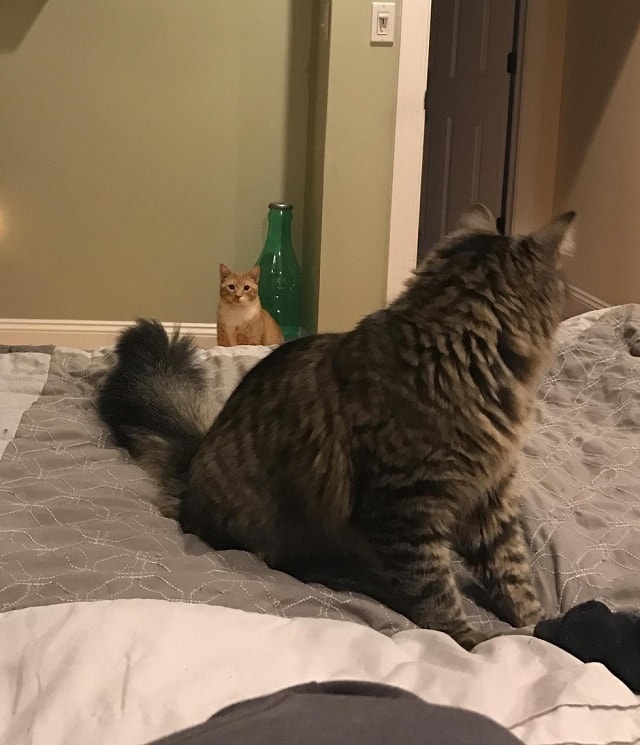 When she is playing around with her other cat, the ginger boy just watches them from afar.
