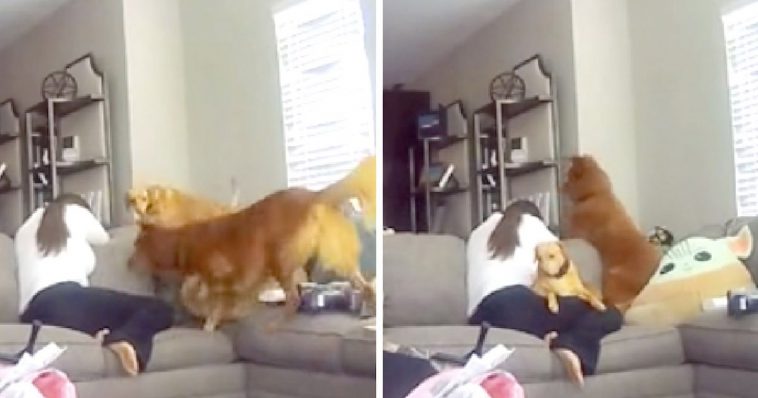 Without pausing for a second, the distressed puppies run to Drea’s side and cuddle up next to her, undoubtedly doing their best to soothe the distressed mother.