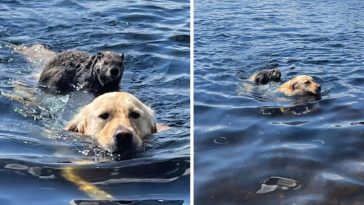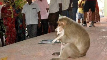 A heartwarming story unfolds as a monkey adopts a puppy, fiercely protects it from stray dogs, and selflessly allows it to eat first.