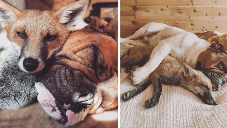 A beautiful bond formed between a fox and a bulldog, fostering a deep affection and companionship between the two.