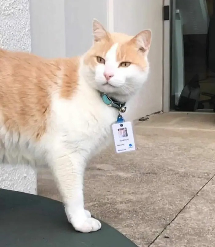 “I first noticed his ID badge on him in June. I was actually having a case of the sads that day, but seeing his ID badge turned my whole mood around!” explained Trollip. “When I first saw him, he wasn’t wearing anything, so I assumed he was a stray. Then someone put a collar and tag on him and now most recently he’s got his own ID badge, which is identical to our actual staff badges down to the call codes on the back.”