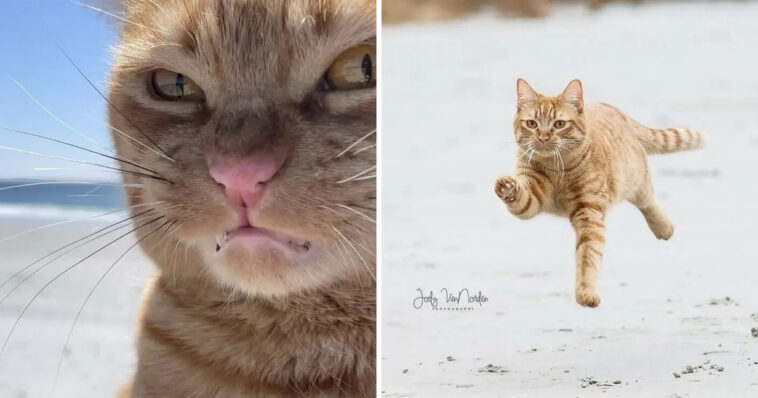 Pumpkin is an adorable adopted cat with cerebellar hypoplasia disease. However, that cannot stop this cutie from enjoying himself at the beach. His current owner recently discovered that he has a true adventurous soul, but this little soul particularly hates the strong wind. His Instagram @iispumpkincat currently has 16.8K followers, and his Facebook page (Pumpkin the Cat) has 44.3K followers.
