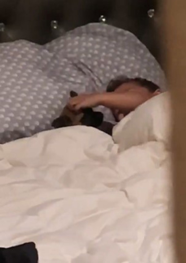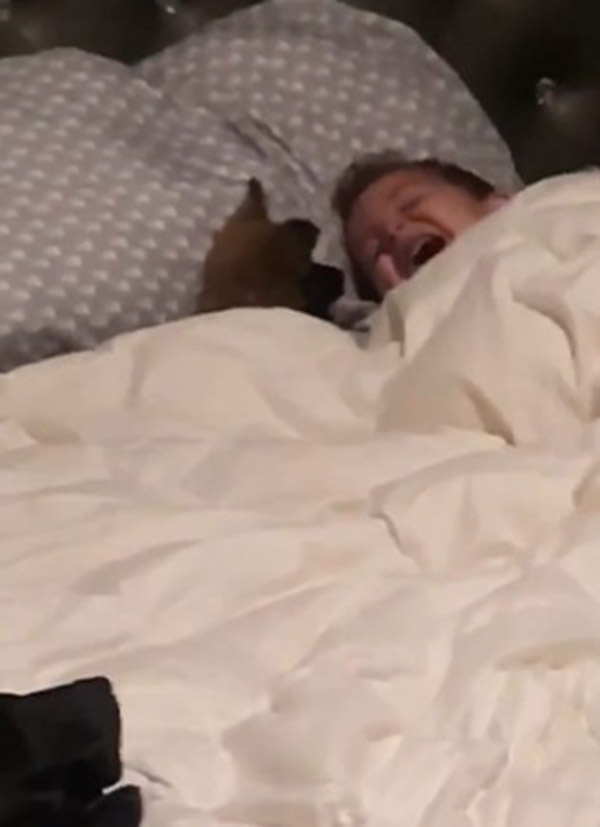 He catches his little boy teaching their new puppy how to howl, while curled up in bed under the blankets with the puppy.