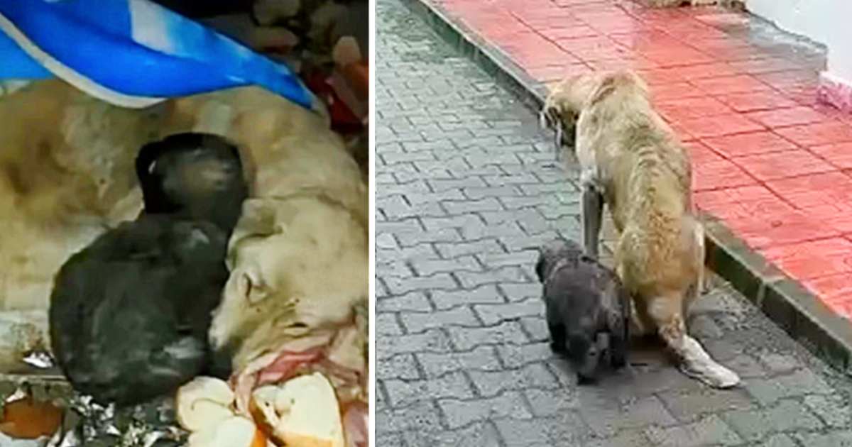 She still tries to protect the 2 puppies from the sounds of the highway, tries to protect the puppies from the teasing of pedestrians.