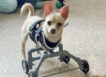 **MANDATORY BYLINE** PIC FROM ASPCA / Caters News – (PICTURED: Chispi wearing her wheelie vest) – A CHIHUAHUA born with no front legs has been given a new lease of life after a team of vets went the extra mile and built her some custom made wheels. Little Chispi spent most of her time being carried and when she did walk could only manage a few steps before falling over. But with the help of American Society for the Prevention of Cruelty to Animals (ASPCA) the pup can now run and live a normal dogs life. They designed a custom-made wheelie vest created by a company that also made prosthetics for a dog born without hind feet. Chispis disability also weighed heavily on her owners who briefly considered giving her to a shelter, according to ASPCA. SEE CAERS COPY