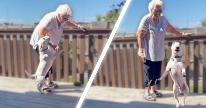 Titan the two-year-old Bullterrier loves when Grandma comes around! She’s his favorite dancing partner, and he really puts his skills on display in her presence.