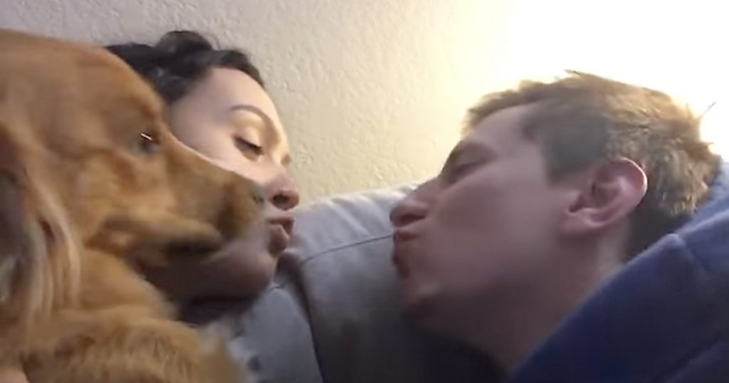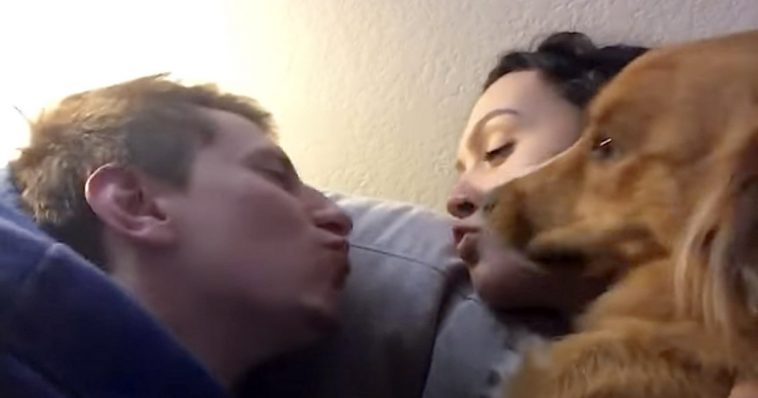 In the video below, Mom and Dad go in for a kiss… but the pooch isn’t having it! The envious boy forces his way in between their faces to get in on it.