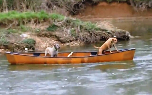 In the video below, we see Rusty the Redbone and Bullet the brindle Mountain Cur screaming for help from the canoe. The canoe has blown away due to a strong gush of wind.