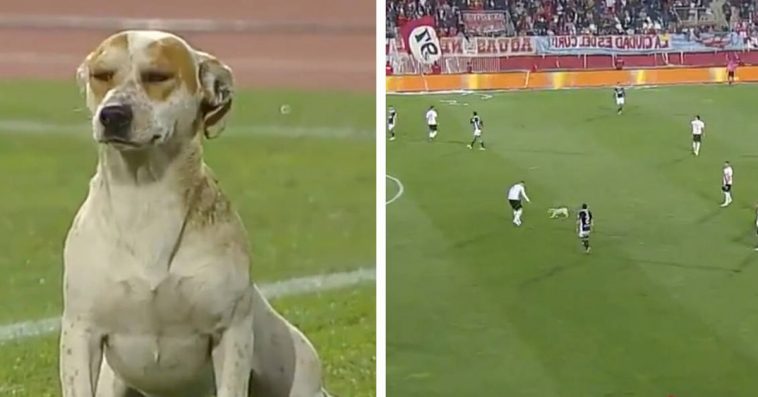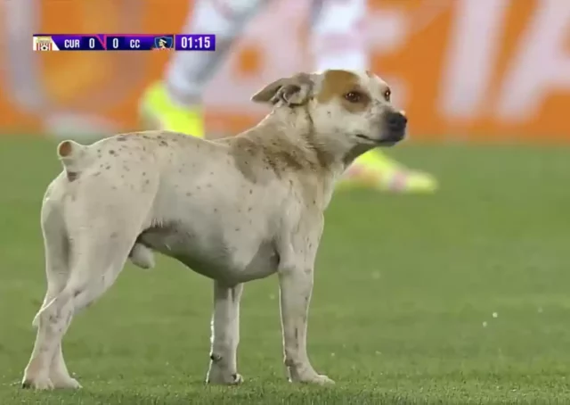 Without warning, random dog prance amongst the players like a little sports star. The referee quickly blew his whistle, bringing the match to a halt.