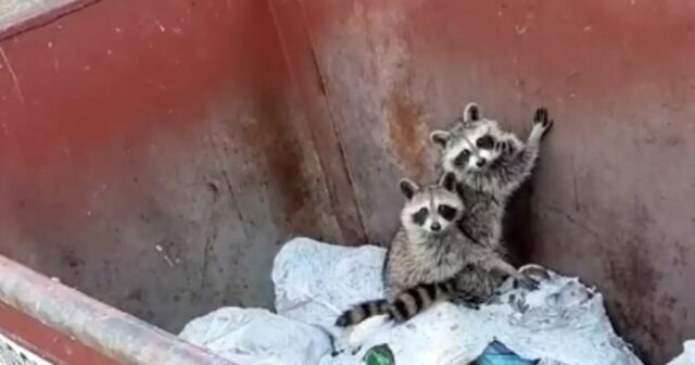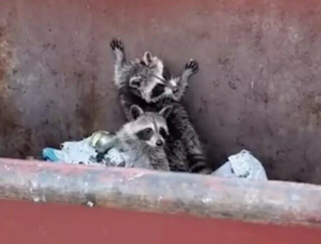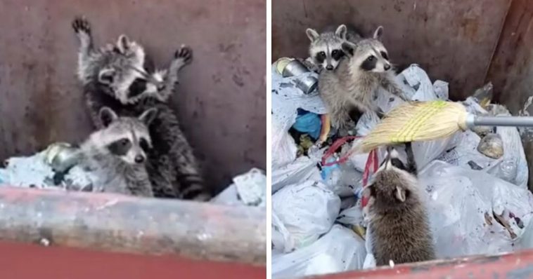 “That’s when I heard some scratching noises and saw two tiny black paws trying to reach the top of the bin,” Brooks said. “We walked over and that’s when I noticed three baby raccoons trying to get out, but the trash was too low for them to do so.”