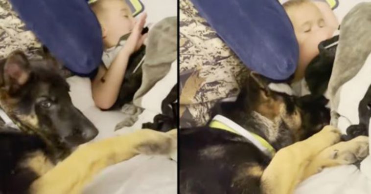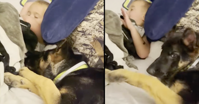 This sneaky pup lies down next to his sleepy brother for an adorable nap. But there’s an ulterior motive; When the dog brings his head back up, he has the pacifier!