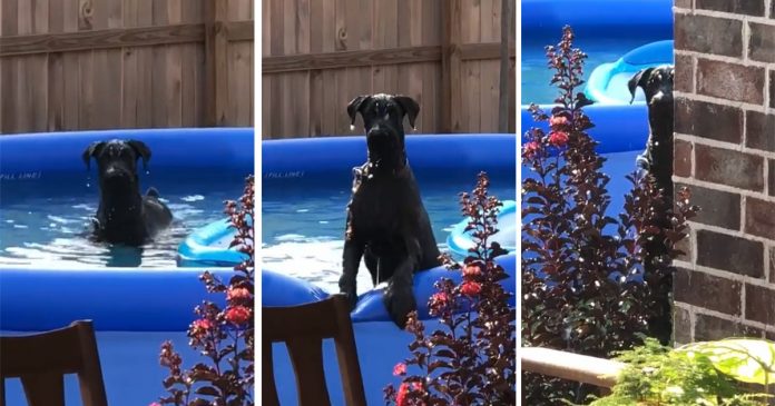 Realising that someone seemed to be watching him playing and splashing around in the pool, the dog quickly paused