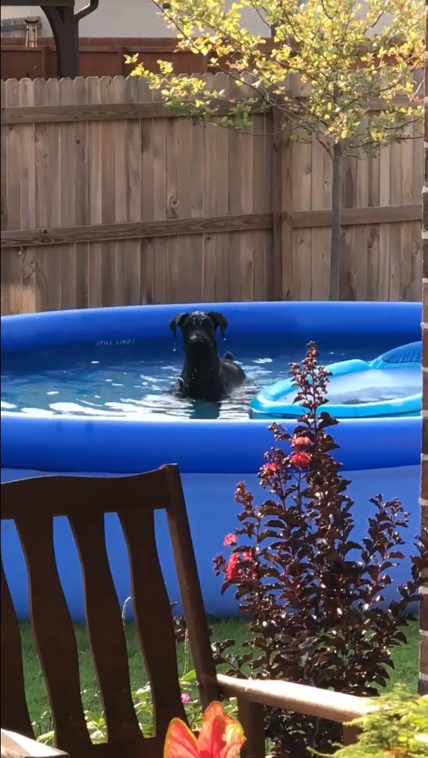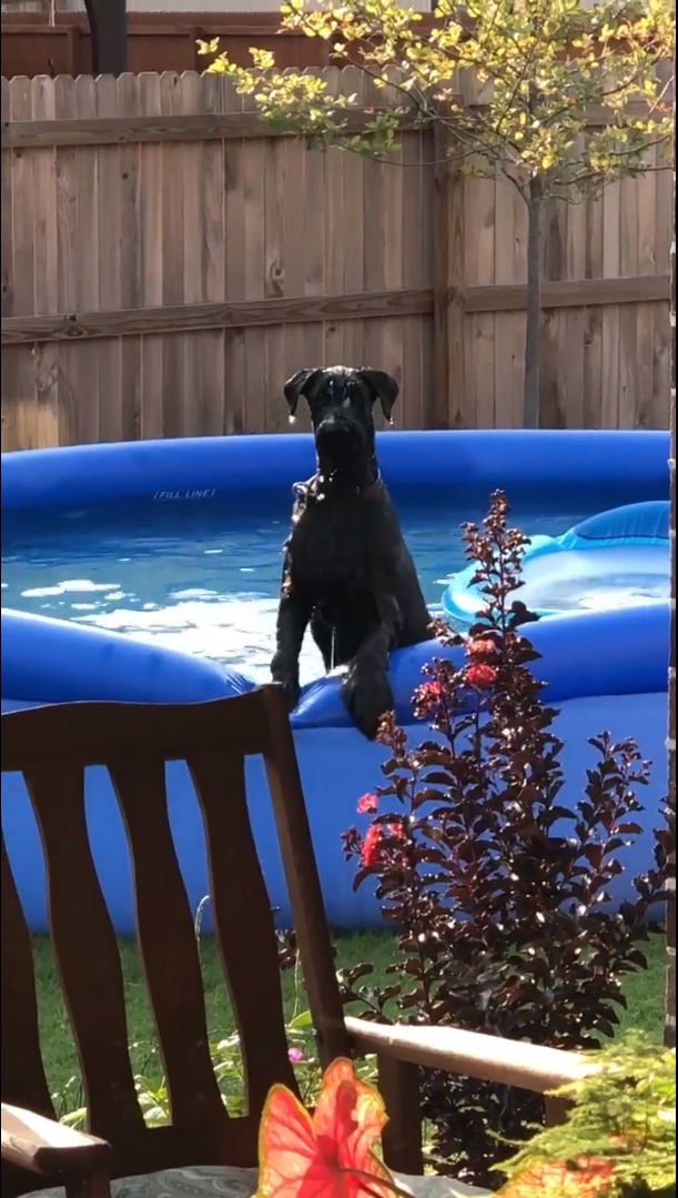 The Schnauzer was happily splashing around in the pool but his owner, Jerry Gordon looked out the window to watch his antics.