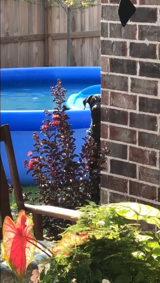 Baxter the dog was enjoying taking a dip in the inflatable pool when he realised that someone was watching him.