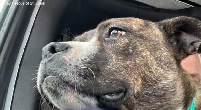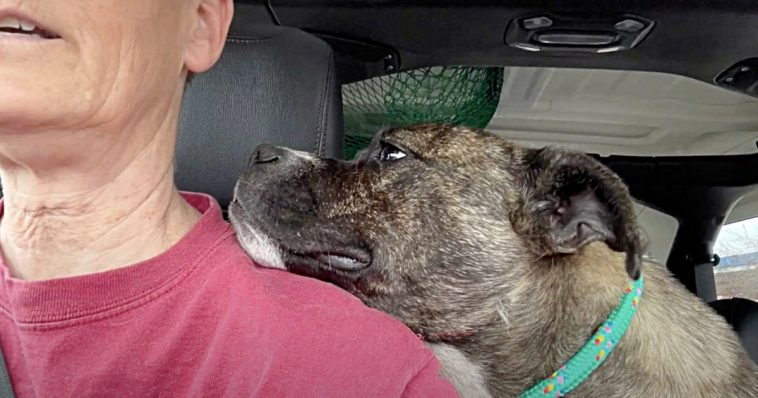 Once they were in the car, the dog rested her head on the rescuer’s shoulder, thanking her for saving her life.