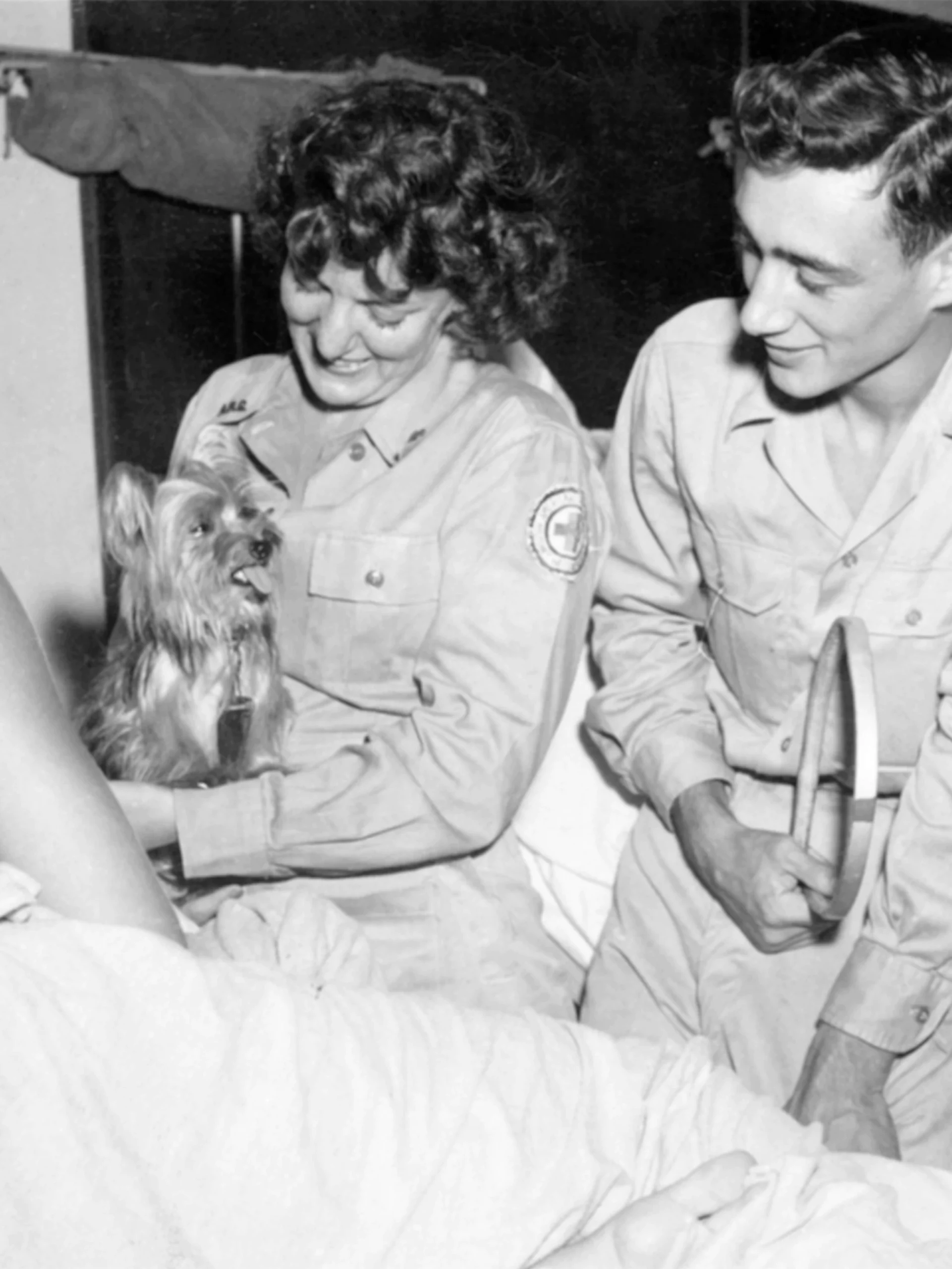 When Wynne caught dengue fever and was sent to the 233rd Station Hospital, Wynne’s friends brought Smoky to see him, and the nurses were charmed by the tiny dog. They asked if they could bring her around to visit the other patients who were badly wounded.