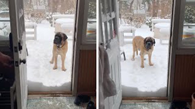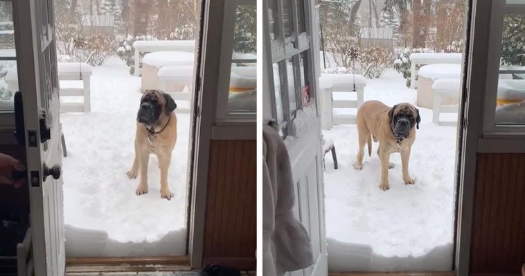 Chris opens the door for his English Mastiff, Joe, to come back inside. Joe had been enjoying the snow in the yard, but there was a small mound of snow that had built up on the step by the door… and the dopey dog doesn’t like that one bit!