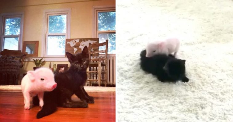 Although it may seem unlikely for a cat to befriend a piglet, this inseparable couple demonstrates that in the animal world, impossible is nothing. When her two-week-old orphaned piglet friend is around, a special needs kitty who suffers from seizures calms down.
