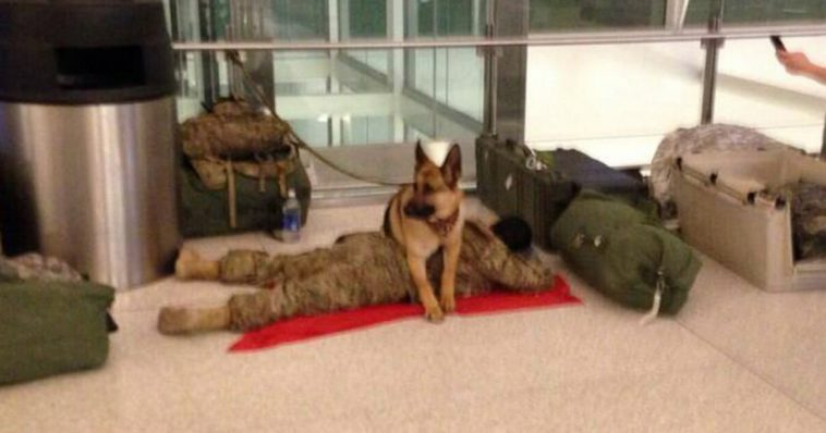 And one particularly exhausted soldier’s battle buddy took it upon himself to guard and protect her during her sleep by lying directly on top and keeping a lookout.