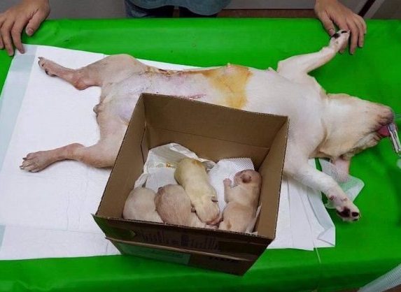 Despite more than 5 hours of dedicated care, the mother dog could not survive, leaving behind four newborn puppies who were left without a mother.