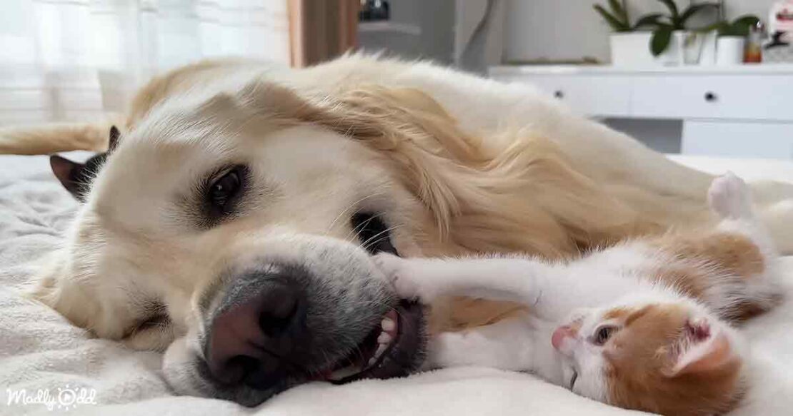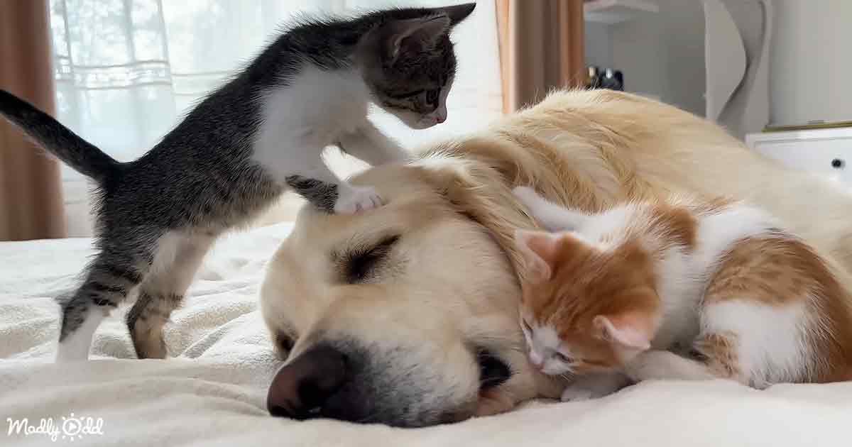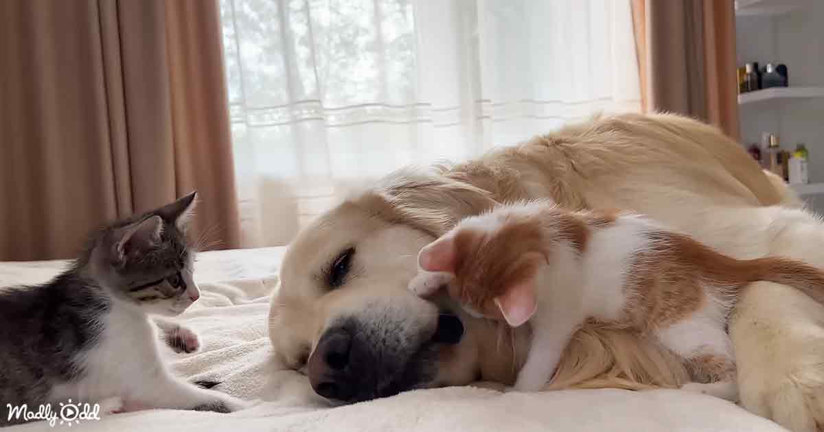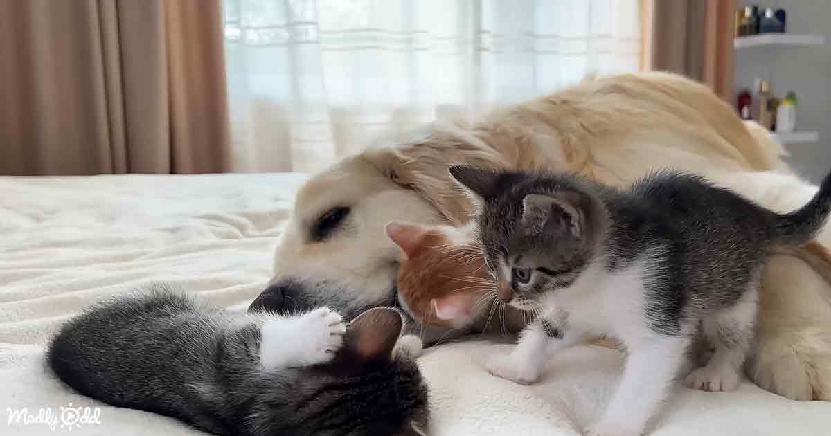 Bailey, the golden retriever, is having quality time with his favorite tiny terrors. In this video, you will see one begging for attention from anyone who will give it. Another is minding their own business, while little orange is striving to be a dentist and trying to give Bailey a complementary cleaning.