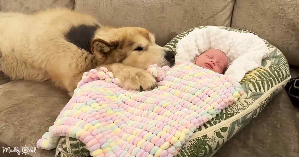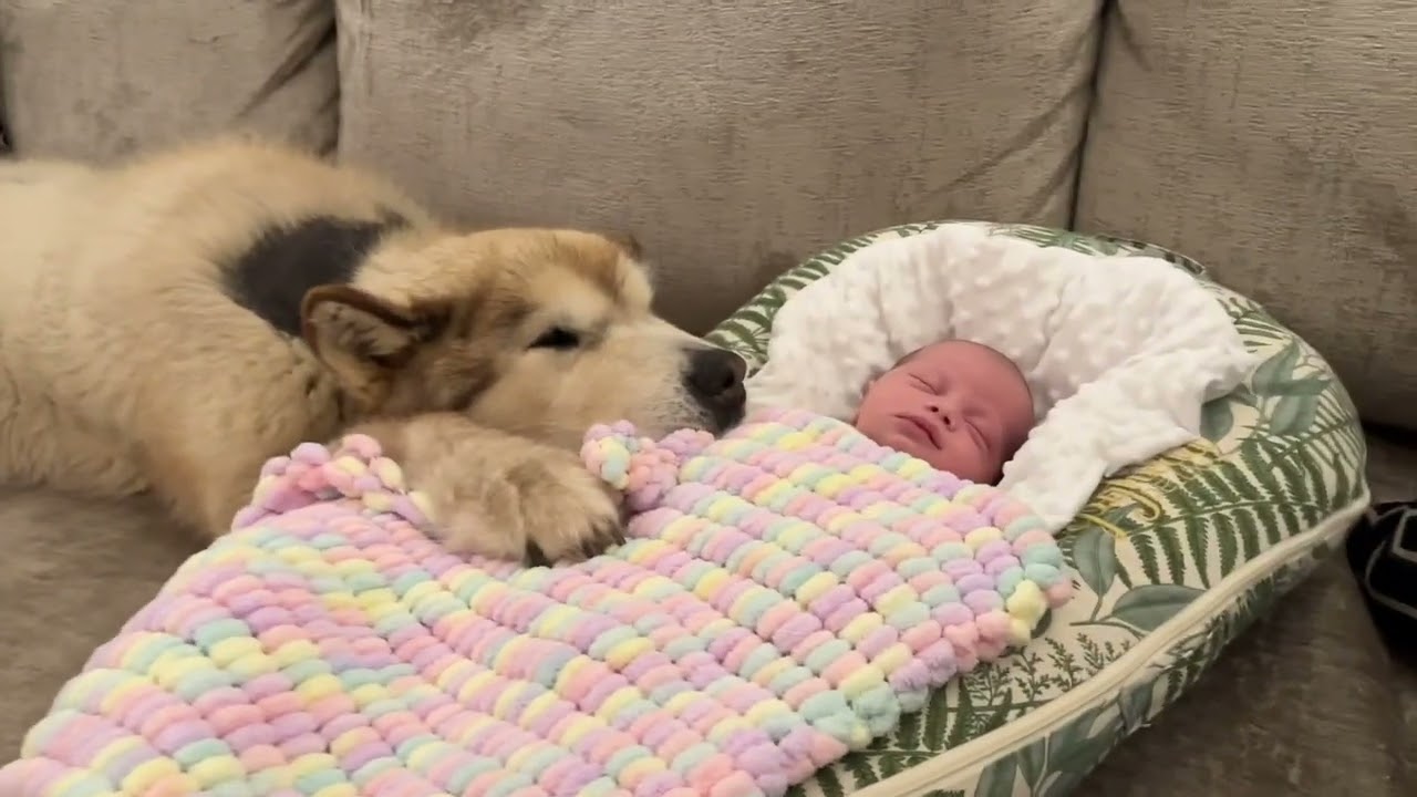 The dog responded with a soft howl whenever the newborn’s parents asked Phil to speak. He sat next to the baby in such a way that made him look like a proud lion. While the baby slept peacefully, Phil waited patiently for his baby brother to wake up.