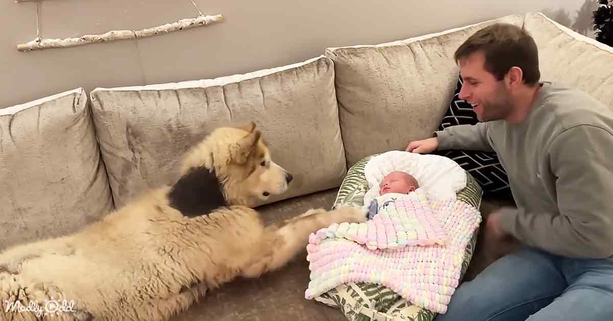 Soon, his dad went over to the other side of the basket, and Phil got a better opportunity to look at the baby. Finally, his dad asked Phil to say woof, and the giant Malamute lovingly responded. However, he ensured he wasn’t too loud to disturb the sleeping baby.