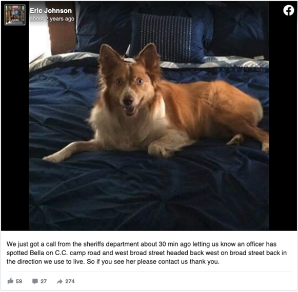 “To say that I wasn’t starting to lose hope in ever finding her again would be a lie,” Eric wrote. “Me and my wife would pray daily that god was keeping her safe out there until he brought her home to us.”