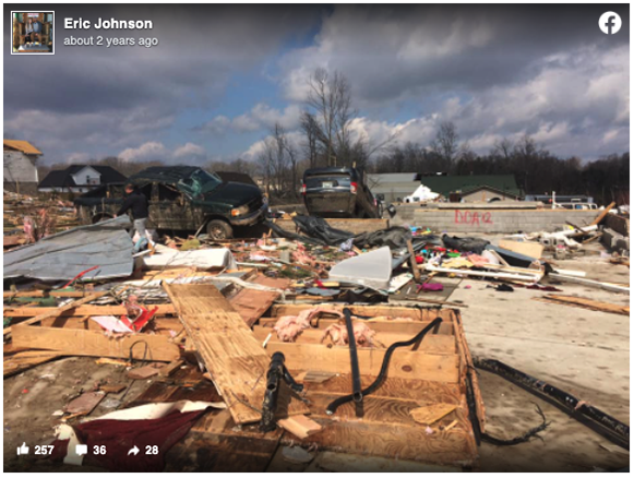 “At 1:15 [AM] my dog woke us up going completely insane and she never does that,” Eric wrote on Facebook. Waking in the middle of the night, he turned on the news and found there was a tornado warning.
