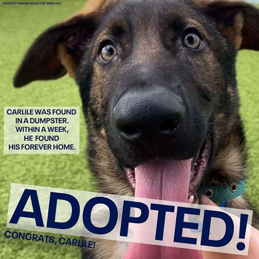 According to the Humane Society of Tampa Bay, Carlile, a 5-month-old German Shepherd pup, was found in a dumpster last month. He was found after workers from a nearby car wash heard a “whining noise.” The boss investigated, and found “desperate eyes staring back at him” from the trash.