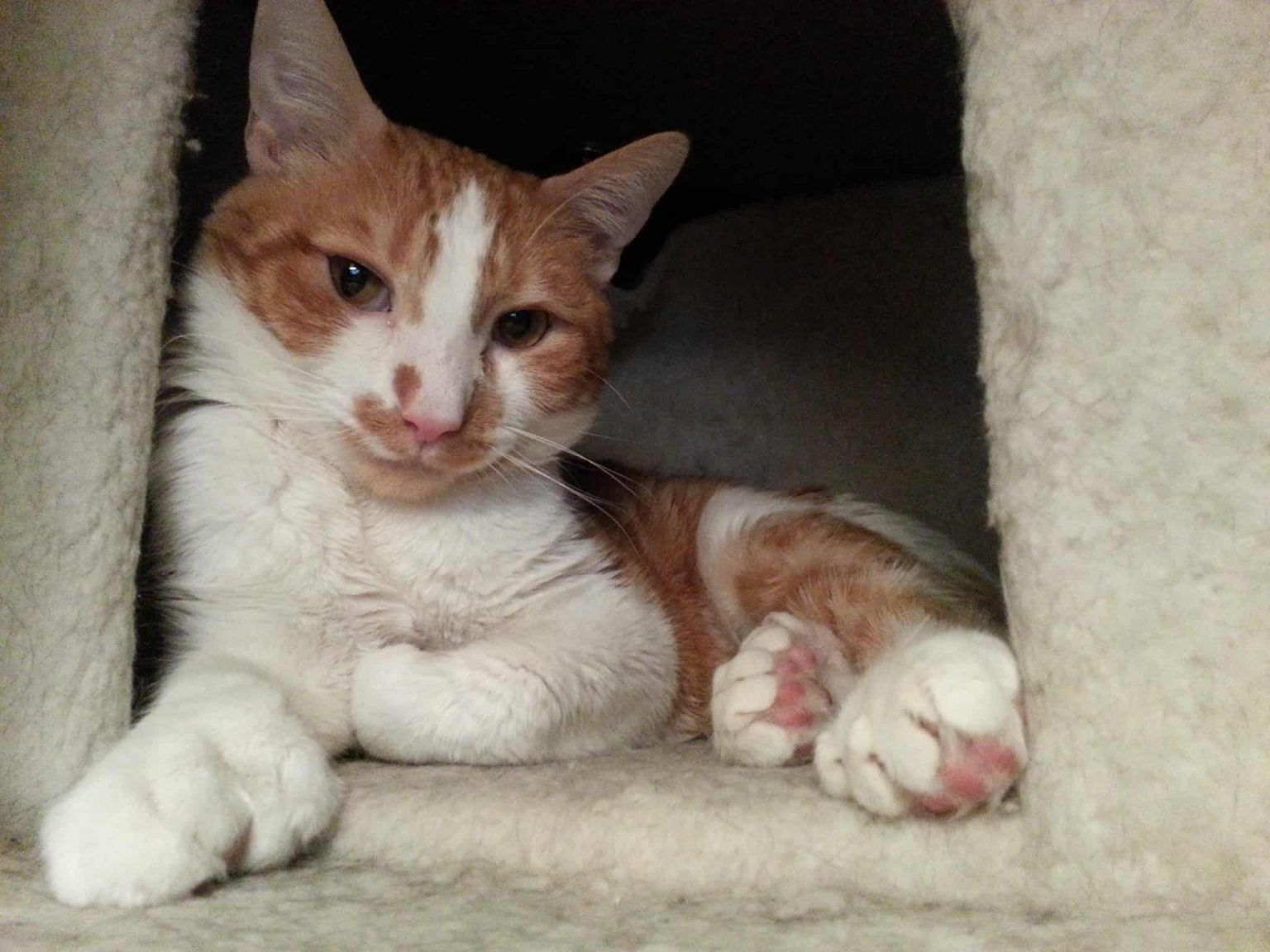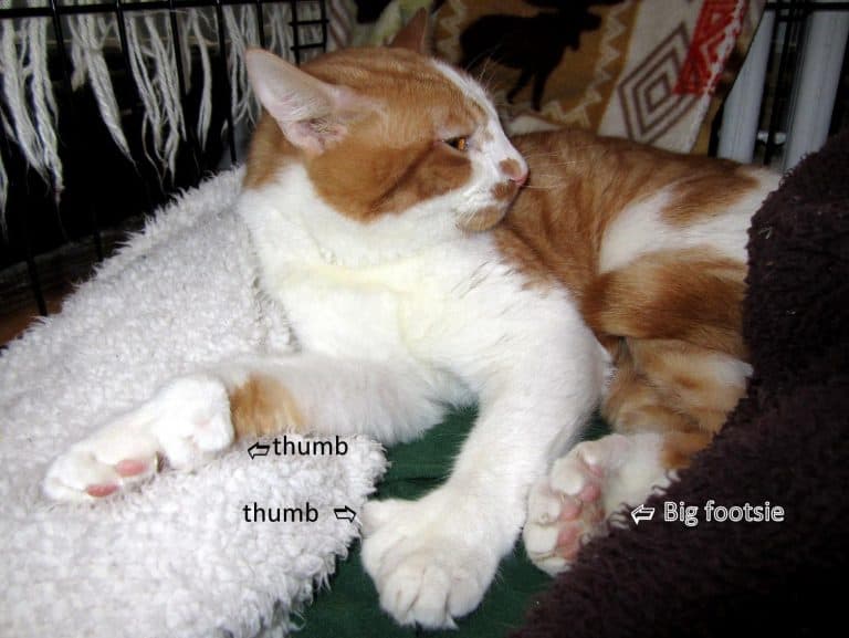 His front paws have the signature of polydactyly “big toe” cats, which resemble attractive gloves. His hind paws have the appearance of beaters. His hind toes are among the smallest I have ever seen. I can not stop myself from gently caressing my hind legs occasionally just to see him shaking his leg because I tickle too much.