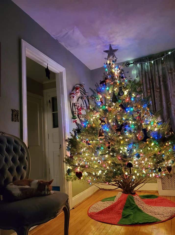 Jake is also a big fan of Christmas trees. I don’t mean he loves to climb them or swat at the decorations; he just appears to like being around them. Every year when I bring in a newly cut tree from a friend’s Christmas tree farm, I have to relocate an old chair with a velvet seat cushion. I placed the chair at the living room entrance, across from the tree, and Jake could be seen under the tree or on the chair looking at it, or resting quietly, throughout the holiday season.