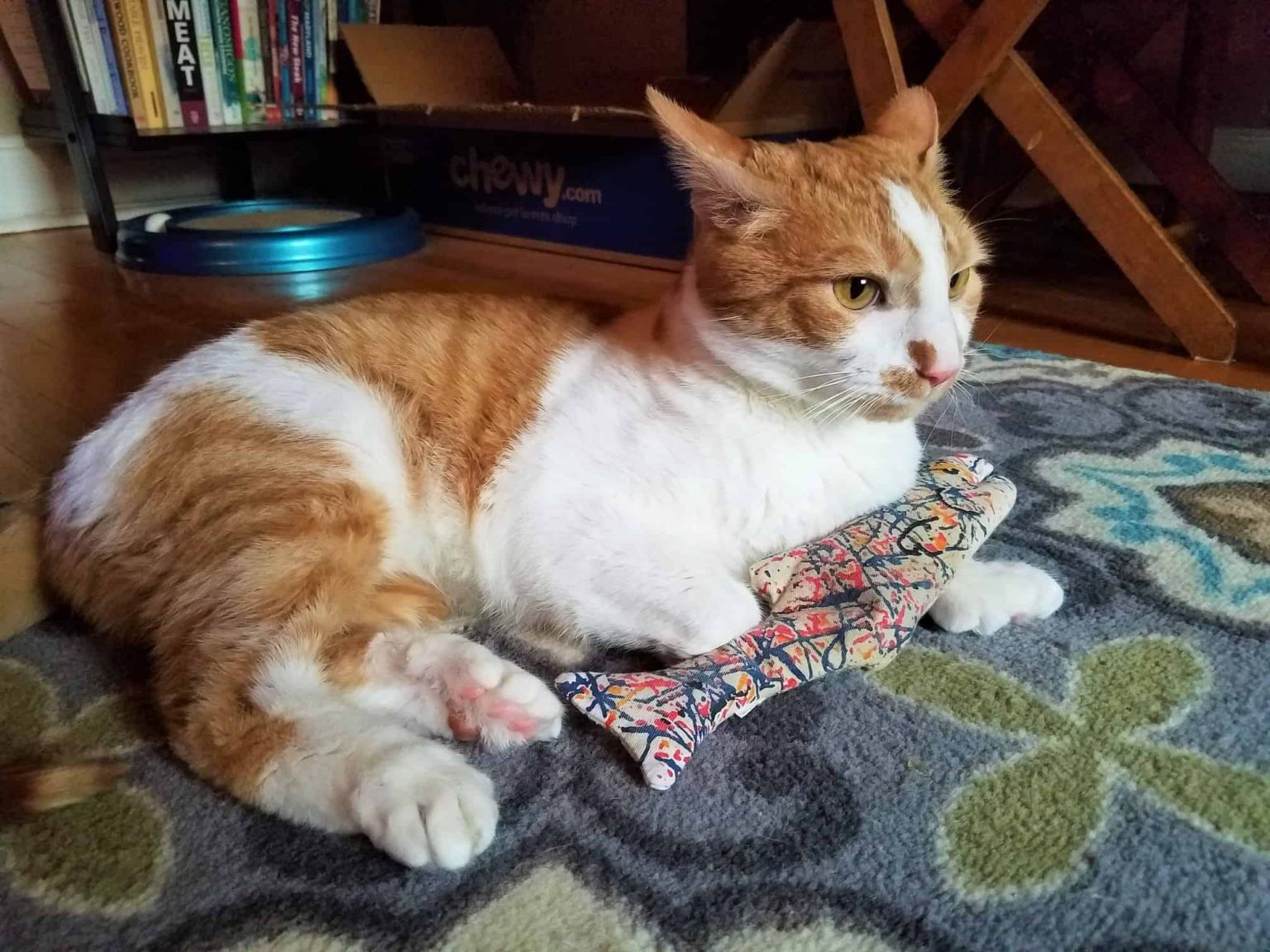 He gets so excited and happy over lunch that he starts to roll from one side of the kitchen floor to the other, back and forth, back and forth, flip! That’s what I refer to as his “dinner dance.”