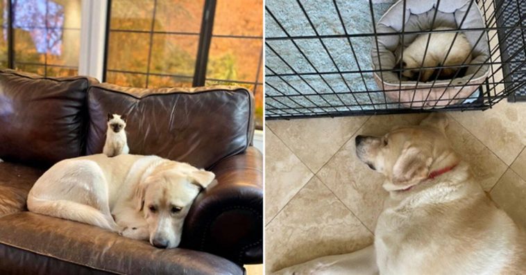 After being brought home, Kendal’s two rescue pups immediately check out the new member of the family. Even though the kitten was not friendly, the two dogs were fascinated by her, especially the Labrador Truvy.