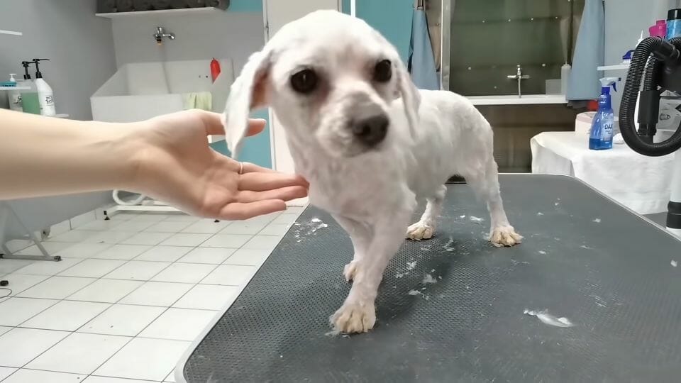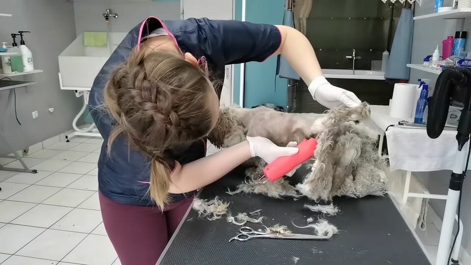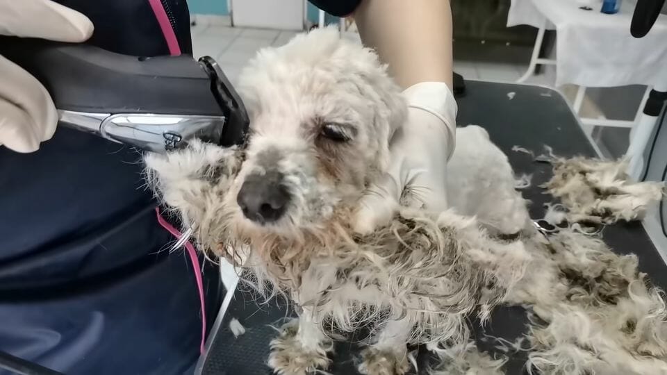 The groomer carefully trims off the dog’s rough, tangled fur, and applies an antiparasitic treatment.