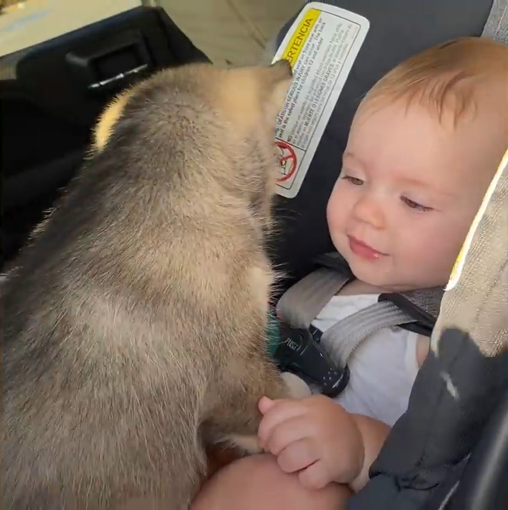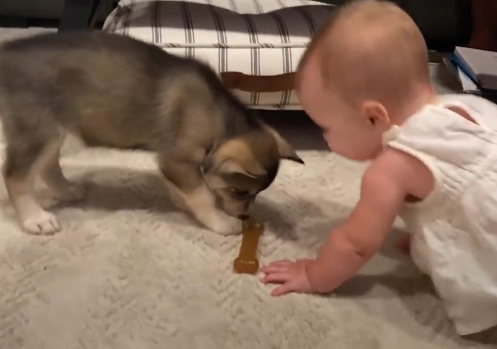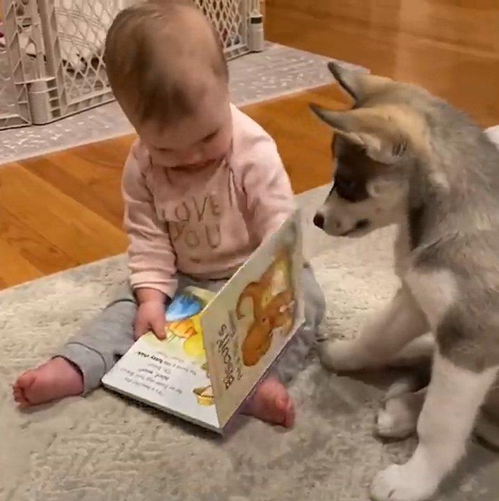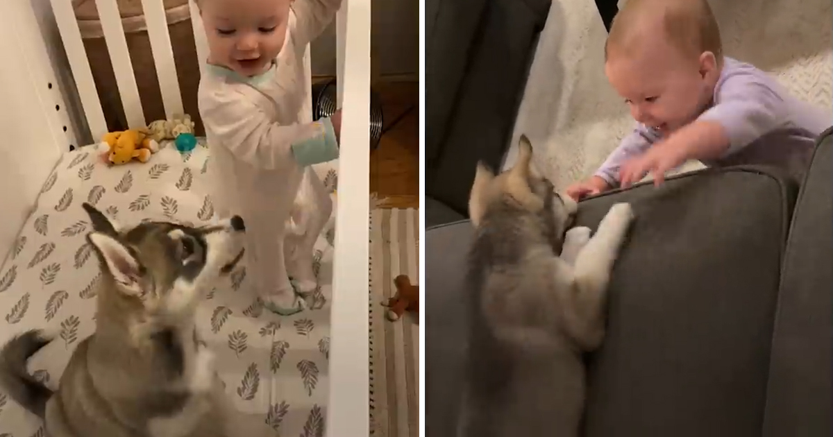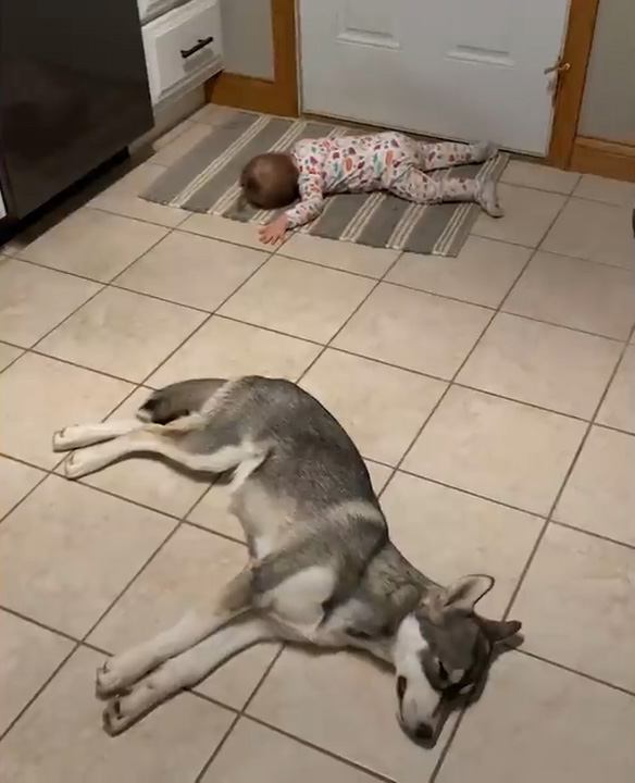 Well, this is exactly what happens in the case of baby girl Hazel and baby Husky Rio, who arrive into the world at the same time. Jen, Hazel & Rio’s mum, remembers the early days when the two began exploring the house together. She recalls that they were always together in whatever they did.