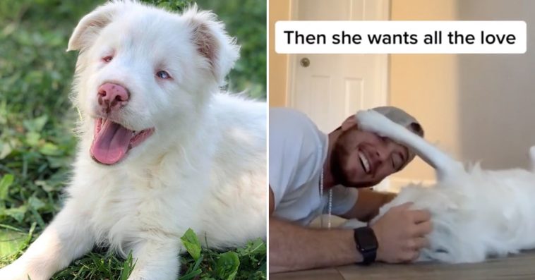 Plum is a nine-month-old deaf and partially blind mini Aussie who resides in Nashville, Tennessee, with her owner Aiden Mann and her big sister Lola, a five-year-old Staffy-Dane mix.