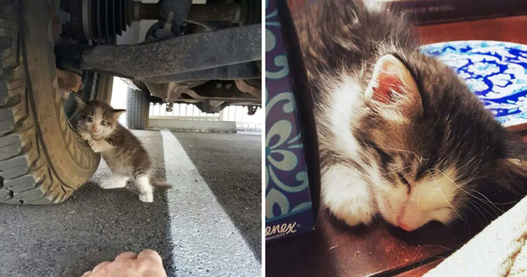 When this guy came across a scared kitten having her boots clinging to the truck tire, he just could not leave her alone. Mommy kitty run away quickly after that and she never came back to this little bean. He knew that he should be the one who helped this poor thing out of the tire as well as the fear of stranger.