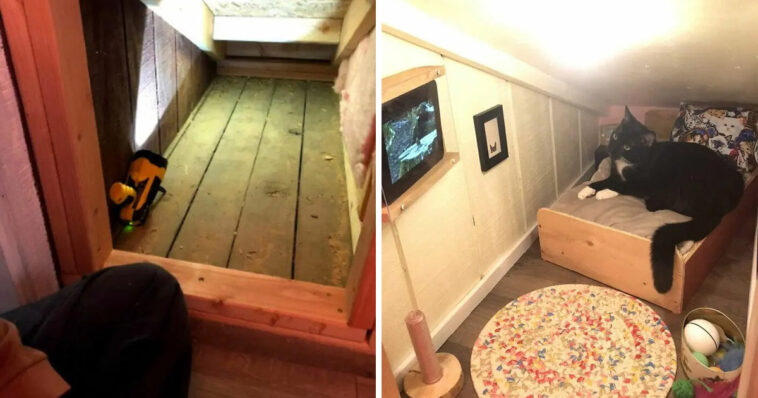 Bryan was having his house under remodeling when he came upon a space in his bedroom. It wasn’t really that big, but it was enough for him to decide to turn that little vacancy into a delightful surprise for his new cat Wyatt. Bryan got on to build a cozy bedroom from scratch. Well, Wyatt’s room might be small, but it sure was even more furnished than any of ours. It had a comfy bed, a rug, a scratching pole, wall decorations, and even a TV. Bryan’s tiny project immediately caught the attention of the media. His Twitter post got over 55.2K likes and 16K retweets.