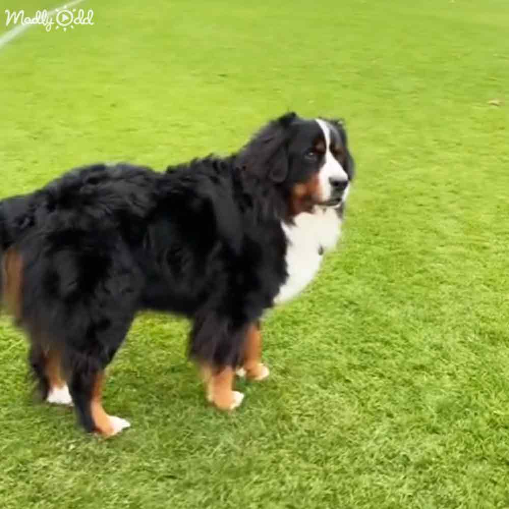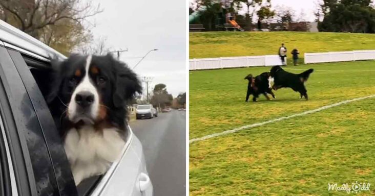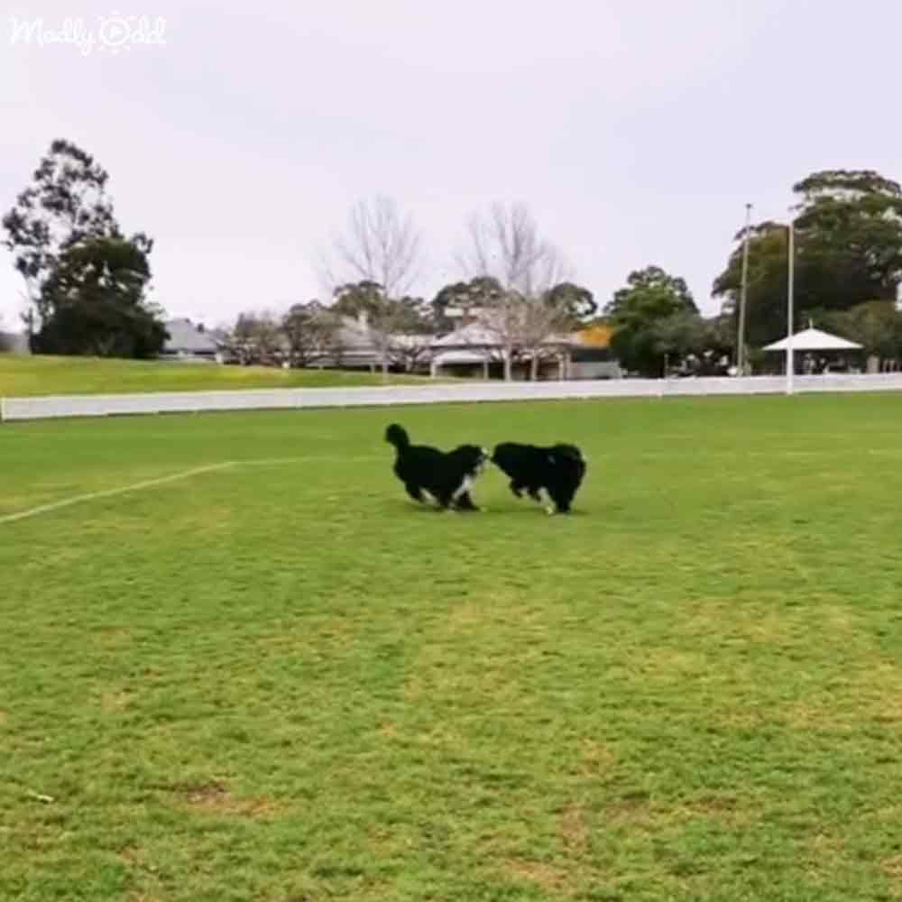 However, the reunion doesn’t end there: the dogs separate and go to greet their friend’s owners. The video ends as Bow is shown running up to @macktheberner, while Mack is shown sprinting over to Bow’s owner across the field.