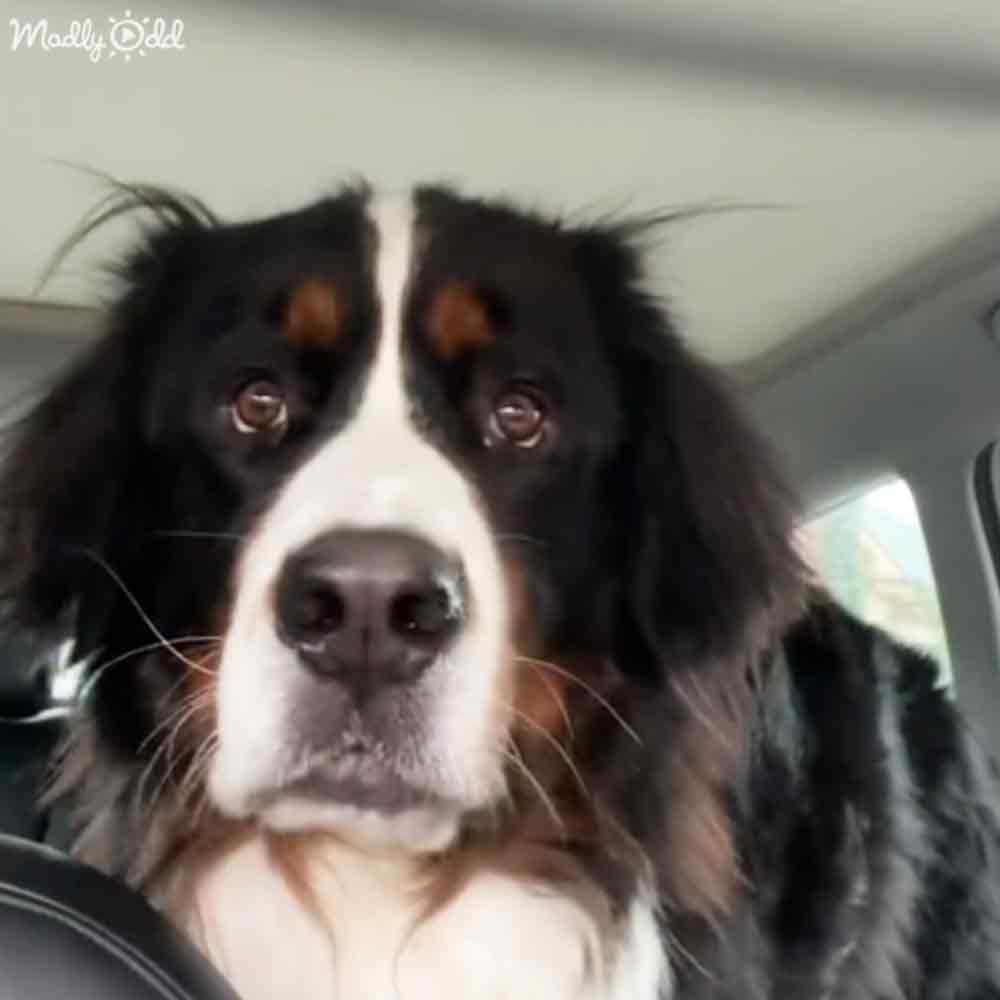 Beautifully colored in a combination of black, white, and brown, we see Mack the Bernese Mountain Dog sitting in the back of a car. Like most dogs, he seems to be enjoying the ride.